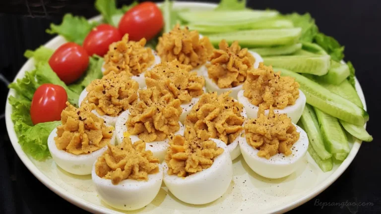 Trứng ác quỷ (Deviled Eggs) là món trứng luộc quen thuộc với phần lòng đỏ được trộn mịn và nhồi lại vào lòng trắng. Ở phiên bản này, sốt hummus từ đậu gà được dùng thay cho mayonnaise, giúp món ăn giảm béo, giàu đạm thực vật và dễ tiêu hơn, rất phù hợp cho bữa tối nhanh, nhẹ nhàng nhưng vẫn đủ chất.