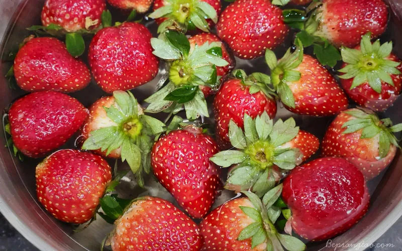 Dùng baking soda: Hòa 1 thìa cà phê baking soda vào 1 lít nước, ngâm dâu tây trong 10 phút, sau đó rửa lại bằng nước sạch.